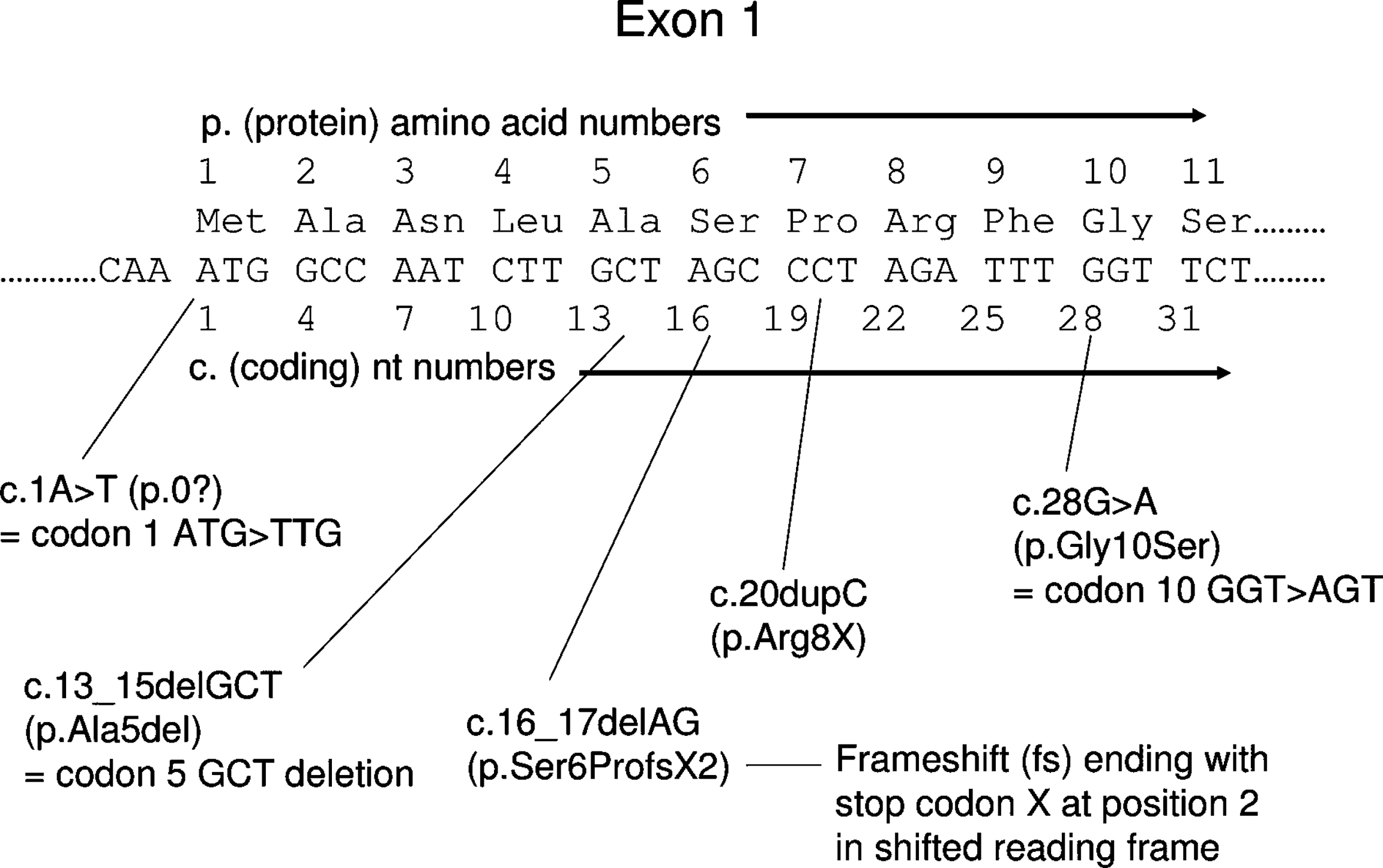 Figure 1. Standard mutation nomenclature (Ogino et al. 2007). According to this guideline, genetic mutations can be represented for coding DNA reference sequences (c. prefix ) and protein-level amino acid sequences (p. prefix).